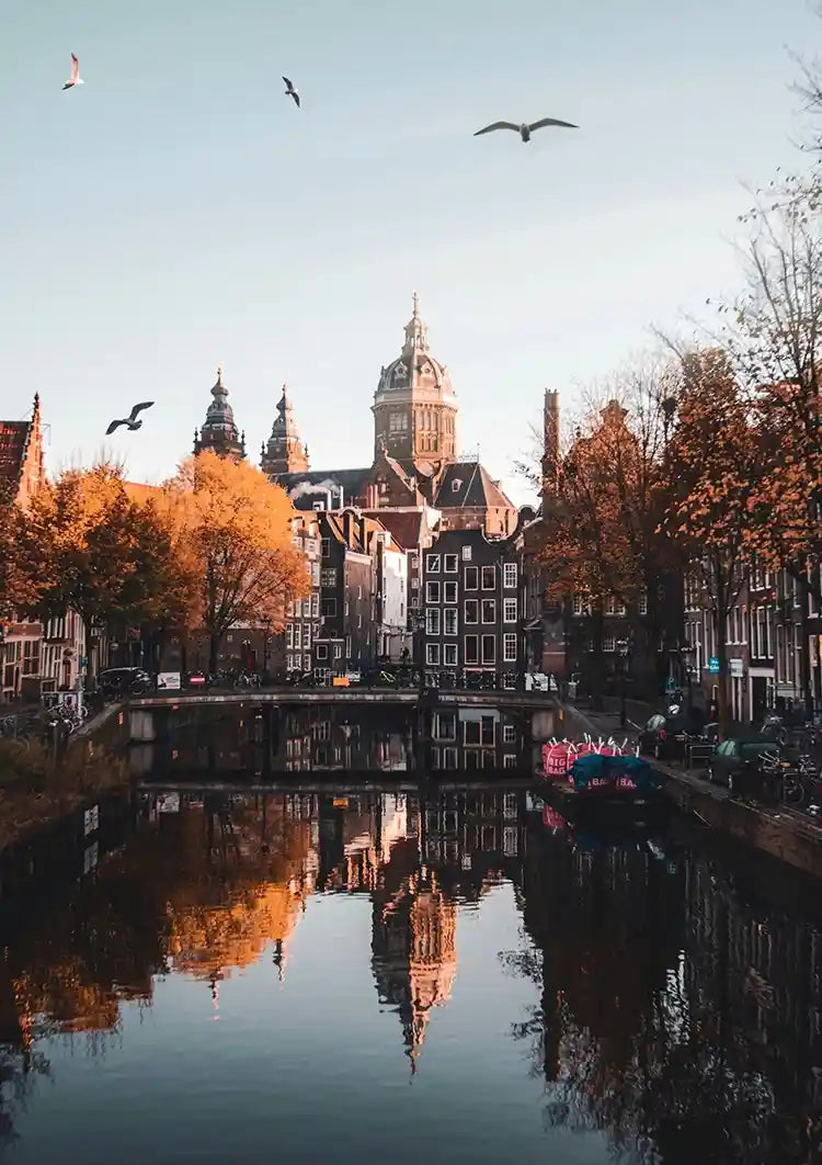 Dit schilderij toont een uitzicht over Amsterdam met een gracht die historische gebouwen en bomen weerspiegelt.