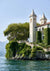 Op dit schilderij zie je een eiland, met een grote witte toren.