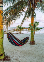 Een schilderij van een hangmat tussen twee palmbomen in.