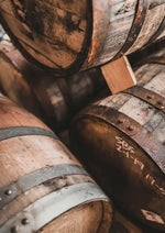 Dit schilderij toont een verzameling houten vaten met zichtbare ouderdom en markeringen.