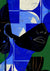 Een geometrisch gezicht in blauw, wit en zwart, met grafische patronen en lijnen.