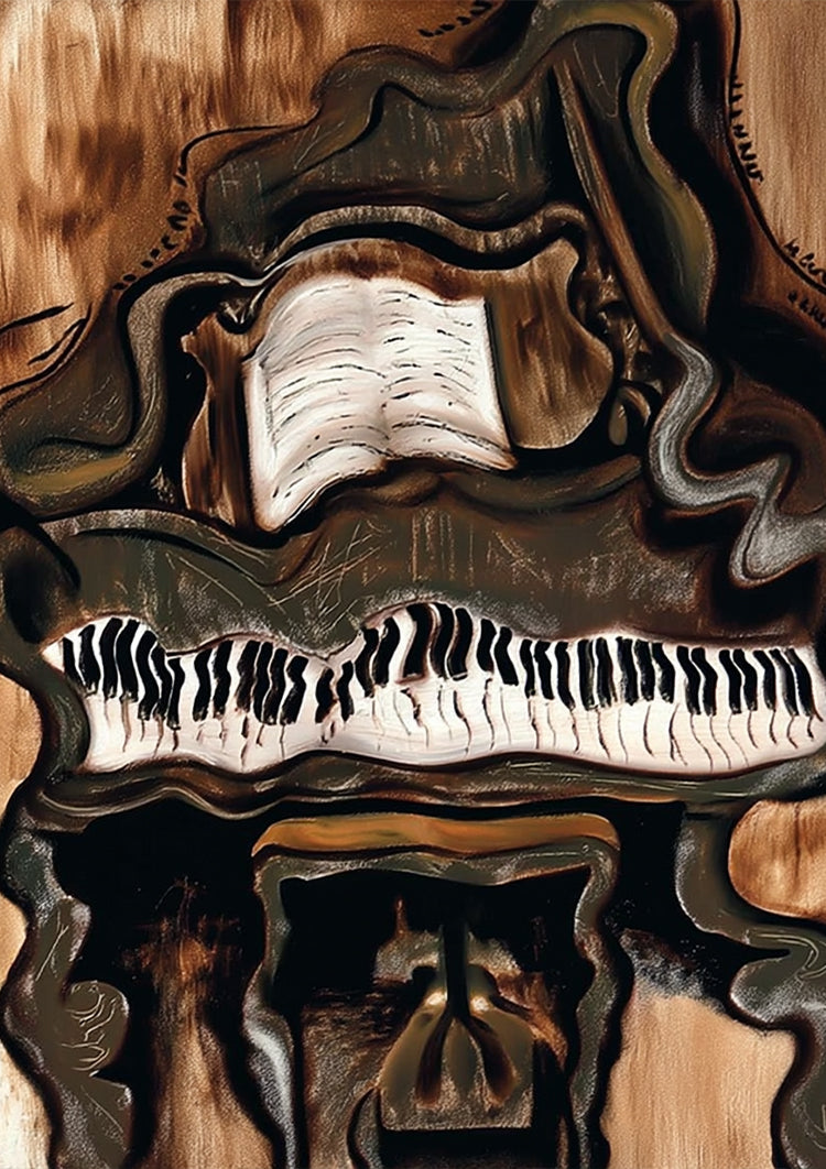 Een verwrongen piano met notenblad, geschilderd in warme bruintinten met een surrealistische sfeer.