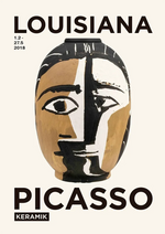 Dit schilderij promoot een Picasso-tentoonstelling in het Louisiana Museum of Modern Art. Het toont een gestileerd gezicht, opgedeeld in zwart-witte delen, wat het artistieke erfgoed van Picasso belichaamt.