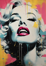 Dit schilderij toont een kleurrijk portret van Marilyn Monroe met dramatische spatten gele, roze en blauwe verf.