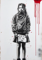 Dit schilderij toont zwart-witte graffiti van een jong meisje met een bord met de tekst.