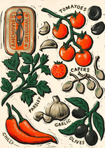Dit schilderij toont een artistieke illustratie van ingrediënten, waaronder een blikje ansjovis, tomaten, rode chili, knoflookteentjes, zwarte olijven in een decoratieve stijl vormgegeven.