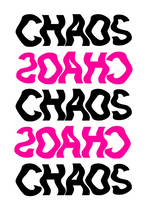 Dit schilderij is stoer en chaotisch tegelijk. Met afwisselende kleuren zwart en neonroze, weergegeven in een krachtig, vervormd lettertype dat een effect van beweging of trilling geeft.