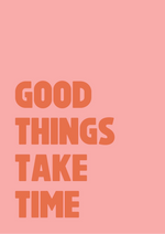 Dit opvallende schilderij met de tekst "Good Things Take Time" in vetgedrukte, koraalkleurige hoofdletters is een inspirerende herinnering aan geduld en doorzettingsvermogen. Een stijlvolle toevoeging aan elke ruimte!