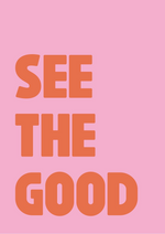 Dit inspirerende schilderij op een roze achtergrond straalt positiviteit uit met de opvallende, oranje tekst 'SEE THE GOOD'. De eenvoudige, duidelijke lay-out benadrukt de kracht van optimisme.