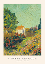 Dit schilderij "Landschap" (1925-1928) van Vincent van Gogh toont een klein wit huis met een rood dak omgeven door weelderig groen en kleurrijke bloemen. De lucht is getextureerd met streepjes groen en blauw.