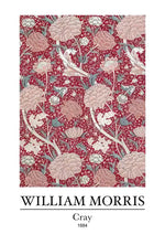 Dit schilderij, genaamd 'Cray' van W. Morris, toont een uniek bloemenpatroon met roze, beige en grijze tinten tegen een achtergrond van diep rood. Het is een betoverende en eigentijdse creatie.