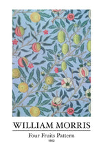 Dit schilderij, genaamd "Four Fruits Pattern" van William Morris uit 1862, toont een decoratief patroon met vier verschillende soorten fruit, elk met unieke details en kleuren.