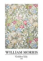 Dit schilderij van W. Morris, getiteld "Golden Lily", toont een prachtig patroon van gouden lelies gemixt met andere bloemen tegen een lichte achtergrond.