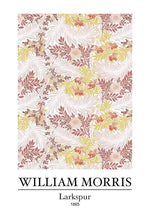Dit schilderij, genaamd "Larkspur" van W. Morris, biedt een gedetailleerd en kleurrijk bloemmotief met levendige rode, gele en roze ridderspoorbloemen, allemaal prachtig geaccentueerd door groene bladeren op een heldere achtergrond.