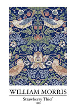 Dit schilderij, genaamd "Strawberry Thief", ontworpen door William Morris in 1883, toont een levendig patroon met vogels, aardbeien en bladeren tegen een diepblauwe achtergrond.