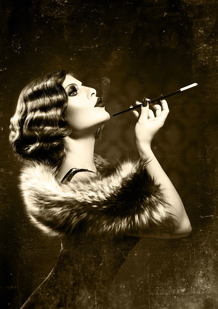 Een schilderij van een vrouw met vintage vingergolven en een bontstola, die rook uit een lange sigarettenhouder uitademt.