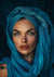 Dit schilderij toont een oriëntaalse vrouw met blauwe ogen en gezichtstatoeages, gehuld in een blauwe hoofddoek die haar haar bedekt. Haar intense blik en sproeten voegen karakter toe aan haar mysterieuze uitstraling.