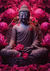 Dit schilderij toont een stenen beeld van Boeddha in een meditatieve houding, omringd door levendige roze lotusbloemen tegen een serene achtergrond.