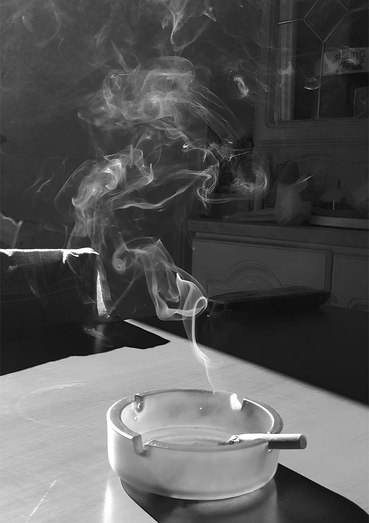 Zwart-wit schilderij van een asbak waar een sigaret in ligt waarvan rook opstijgt.