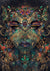 Dit schilderij toont een ingewikkeld ontworpen gezicht met uitgebreide bloemen- en vlinderpatronen in groen, blauw, goud en rood tegen een donkere achtergrond.