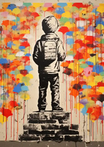 In dit schilderij is een kind met een rugzak afgebeeld dat op een trap staat en naar een muur kijkt die bespat is met, druipende verf in een veelvoud aan kleuren.