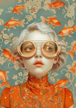 Dit schilderij toont een kind met een grote bril, omringd door verschillende goudvissen.