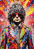 Dit schilderij toont een kleurrijk portret van een man met donker krullend haar en een zonnebril.