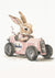 Dit schilderij vangt een konijn achter het stuur van een schattige, roze speelgoedauto. Met een geconcentreerde blik houdt het konijn het stuur stevig vast, terwijl de grote wielen en grille aan de voorkant opvallen.