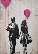 Dit schilderij toont een zwart-witte stencilgraffiti van een man en een vrouw die zij aan zij lopen, elk met een felroze ballon in de hand.