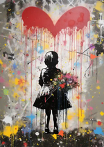 Dit schilderij toont een kunststuk met een silhouet van een kind dat bloemen vasthoudt, tegen een spetterende achtergrond met een groot, druipend rood hart erboven.