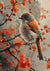 Op dit schilderij zie je een kleine vogel met bruine en oranje veren, gezeten op een tak van een bloeiende boom met levendige oranjebloesems. De achtergrond heeft een zacht, wazig effect met meer bloemtakken zichtbaar.
