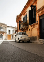 Dit schilderij toont een vintage witte Fiat 500 geparkeerd in een zonovergoten geplaveide straat in een schilderachtig stadje met oude, rustieke gebouwen met houten luiken en balkons.