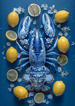 Gemälde einer blauen Hummer, liegend auf einer dunkelblauen Oberfläche, umgeben von ganzen Zitronen, Zitronenscheiben und weißen Blütenblättern. Der Hummer steht zentral mit ausgestreckten Scheren.