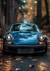 Dieses Gemälde zeigt einen blauen Vintage Porsche 911 mit runden Scheinwerfern, geparkt auf einem mit Blättern bedeckten Weg, umgeben von hohen Bäumen. Die Szene spielt sich am frühen Abend ab, mit Straßenbeleuchtung im Hintergrund. Die Scheinwerfer des Autos sind eingeschaltet und beleuchten den Weg.