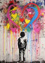 Dieses Gemälde zeigt ein kleines Kind von hinten, das auf ein großes blaues und rotes Herz blickt, umgeben von kleineren gelben Herzen, alle mit tropfender Farbe.