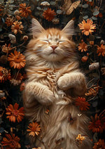 In diesem lebendigen Gemälde liegt eine entspannte orangefarbene Katze zwischen orangen Blumen und flatternden Schmetterlingen, mit geschlossenen Augen und nah beieinanderliegenden Pfoten. Der Hintergrund ist üppig mit Blumen und Blättern, was eine beruhigende Szenerie schafft.