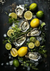 Dieses Gemälde zeigt halbierte Zitronen und Limetten, ganze Zitronen und Limetten, frisch geschälte Austern auf Eis und Zweige grüner Kräuter vor einem dunklen Hintergrund.