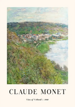Dieses Gemälde mit dem Titel "Blick auf Vétheuil" von Claude Monet zeigt eine stimmungsvolle Landschaft mit einem Fluss, Hügeln, Grünflächen und einem Dorf am Wasser, gemalt im impressionistischen Stil, der das Wesen des Moments einfängt.