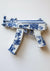 Gemälde eines eleganten blauen und weißen Blumenmotivs auf einer Uzi. Das komplizierte Muster bildet einen wunderschönen Kontrast zur Form der Waffe vor einem einfarbigen, gebrochen weißen Hintergrund.