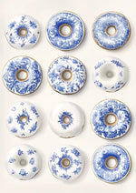 Gemälde von zwölf Donuts mit wunderschönen Delfter Blau-Motiven. Diese detaillierten Muster machen jeden Donut zu einem Kunstwerk.