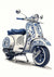 Gemälde eines Vintage-Rollers mit wunderschönen blauen Blumendekorationen. Der runde Scheinwerfer, die Seitenspiegel und blaue Akzente vervollständigen dieses Kunstwerk.