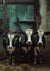 Dieses Gemälde zeigt drei schwarz-weiße Kühe dicht beieinander in einem Schuppen mit einer grünen Tür und hängenden Ketten im Hintergrund.