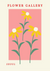 Dieses Gemälde zeigt eine Illustration von drei einfachen, stilisierten Gänseblümchen mit gelben Blütenblättern und grünen Stängeln auf einem sanften rosa Hintergrund. Eine charmante Ergänzung für jeden Raum!