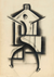 Ein Gemälde mit verblassten Linien, die eine Person vor einem Haus darstellen.