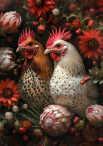 Auf diesem Gemälde sehen Sie zwei Hühner nebeneinander stehen, umgeben von bunten Blumen, darunter orange und weiße. Das eine Huhn hat einen gesprenkelten Körper, das andere ist weiß mit schwarzen Zeichnungen, und beide haben rote Kämme und Kehllappen.