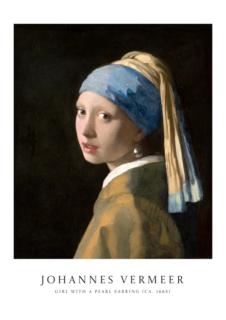Dieses ikonische Gemälde von Johannes Vermeer aus circa 1665 zeigt eine junge Frau mit einem blau-gelben Turban und einer Perlenohrring, die über ihre Schulter zum Betrachter blickt. Es ist bekannt als „Das Mädchen mit dem Perlenohrring“.