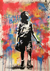 Dit Gemälde zeigt ein Graffiti-Kunstwerk mit einem Kind vor einem bunten, abstrakten Hintergrund mit lebendigen Farbtropfen.