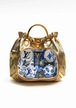 Eine goldfarbene Handtasche mit einem transparenten Vorderfach, in dem sich blaue und weiße Porzellanschälchen mit Blumenmuster und LV-Logos befinden. Die Tasche verfügt über einen Kordelzugverschluss und einen Henkel an der Oberseite.