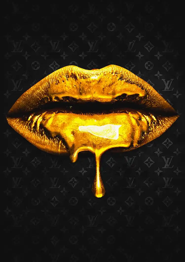 Dieses Gemälde zeigt goldene Lippen vor einem dunklen Hintergrund mit einem Muster.