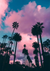 Ein Gemälde mit rosa Wolken und darunter hohen Palmen.